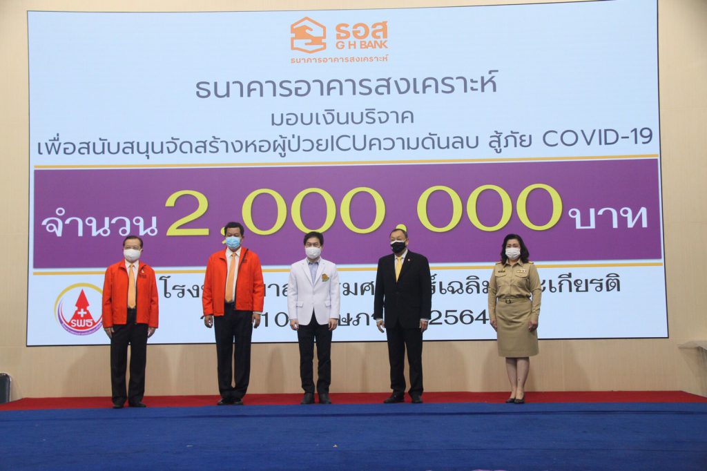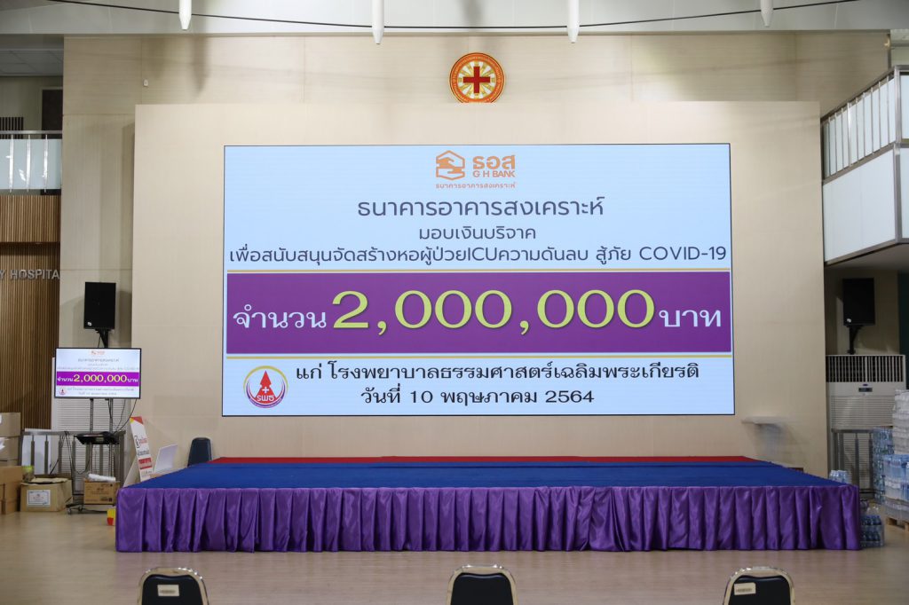 ธนาคารอาคารสงเคราะห์ สนับสนุนงบประมาณ 2 ล้านบาท ให้แก่ โรงพยาบาลธรรมศาสตร์เฉลิมพระเกียรติ จัดสร้างหอผู้ป่วยไอซียูความดันลบแบบห้องแยก เพื่อให้บริการผู้ป่วยวิกฤตที่มีอาการรุนแรงได้เข้ารับการรักษาโรคติดเชื้อไวรัสโคโรนา 2019 (COVID-19) ได้อย่างเต็มศักยภาพและเพียงพอต่อความต้องการที่เพิ่มขึ้น สอดคล้องกับนโยบายความรับผิดชอบต่อสังคมและสิ่งแวดล้อม หรือ CSR ของธนาคาร