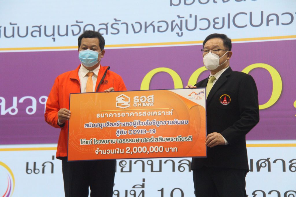 เชื้อไวรัสโคโรนา 2019 หรือ COVID-19 ระลอกใหม่ในประเทศไทยตั้งแต่ช่วงเดือนเมษายน 2564 ที่มีการระบาดขยายเป็นวงกว้าง ทำให้พบจำนวนผู้ติดเชื้อ รวมทั้งผู้ป่วยวิกฤตที่มีอาการรุนแรงมากขึ้น ซึ่งโรงพยาบาลธรรมศาสตร์เฉลิมพระเกียรติ อ.คลองหลวง จ.ปทุมธานี นับเป็นหนึ่งในโรงพยาบาลหลักที่รับส่งต่อตลอดจนดูแลและให้การรักษาผู้ป่วยที่ได้รับผลกระทบจาก COVID-19 มาโดยตลอด ด้วยการจัดตั้งหอผู้ป่วย Cohort หอผู้ป่วยเฝ้าระวัง (PUI) หอผู้ป่วยความดันลบ รวมถึงโรงพยาบาลสนามธรรมศาสตร์ เป็นต้น และเพื่อเป็นการสนับสนุนการดูแลรักษาผู้ป่วย COVID-19 ได้อย่างเต็มศักยภาพ และเพียงพอต่อการรองรับจำนวนผู้ป่วยที่เพิ่มสูงขึ้น ธอส.ในฐานะสถาบันการเงินเฉพาะกิจของรัฐ ที่มีพันธกิจ “ทำให้คนไทยมีบ้าน” ได้ตระหนักถึงการแสดงความรับผิดชอบต่อสังคมและสิ่งแวดล้อม จึงได้ร่วมสนับสนุนงบประมาณสู้ภัย COVID-19 จำนวน 2,000,000 บาท มอบให้แก่ โรงพยาบาลธรรมศาสตร์เฉลิมพระเกียรติสำหรับจัดสร้างหอผู้ป่วยไอซียูความดันลบแบบห้องแยกที่ใช้ในการรักษาผู้ป่วยวิกฤตที่มีอาการรุนแรง โดยมีศาสตราจารย์ ดร.สุรพล นิติไกรพจน์ ประธานคณะกรรมการบริหาร โรงพยาบาลธรรมศาสตร์เฉลิมพระเกียรติ เป็นผู้รับมอบ และมีคณะกรรมการธนาคาร ประกอบด้วย ดร.กิริฎา เภาพิจิตร ดร.กริชผกา บุญเฟื่อง นายชาญวิทย์ นาคบุรี และนายฉัตรชัย ศิริไล กรรมการผู้จัดการ พร้อมด้วยผู้บริหารระดับสูง ร่วมในพิธีส่งมอบ โดยถือเป็นส่วนหนึ่งของการสนับสนุนช่วยเหลือสังคมไทยสู้ภัย COVID-19 ที่ธนาคารดำเนินการมาอย่างต่อเนื่อง อาทิ ส่งมอบหน้ากากอนามัย พร้อมสายคล้องหน้ากากอนามัย จำนวน 10,420 ชุด ให้แก่กระทรวงการพัฒนาสังคมและความมั่นคงของมนุษย์เพื่อนำไปแจกจ่ายให้กับประชาชนในชุมชน อีกทั้งในด้านงบประมาณ สนับสนุนน้ำดื่ม และอาหารกลางวัน ให้หน่วยงานสำคัญต่าง ๆ สถานพยาบาล สถานศึกษา และวัด เป็นต้น